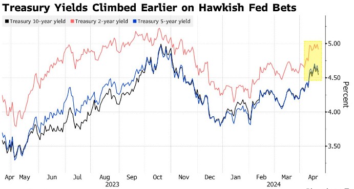 避险热潮给美国债券带来了亟需的提振。此前,市场重新考虑对美国利率走势的预期,给美国债券带来了巨大压力。受强劲的经济数据和美联储官员的鹰派言论影响,基准国债收益率本周触及去年11月以来的最高水平。