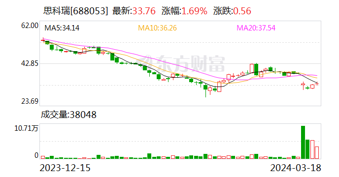 2022年7月8月,思科瑞正式登陆科创板,发行价为55.53元/股,募资净额为12.53亿元。截至3月18日收盘,思科瑞股价较发行价下跌39.20%(前复权),总市值为33.76亿元。